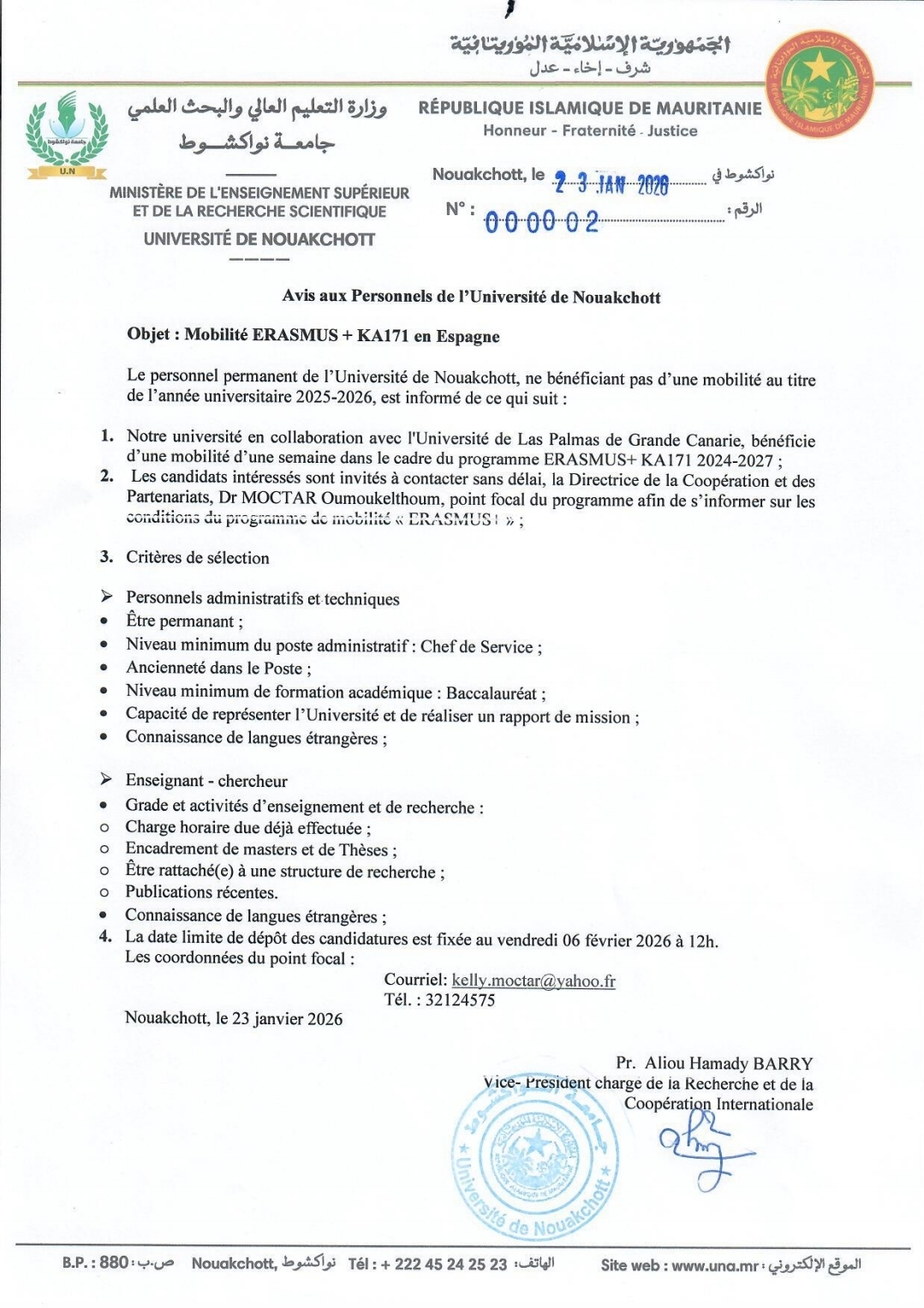 يُدعى المترشحون المهتمون إلى الاتصال فوراً بمديرة التعاون والشراكات، د. مختار أم كلثوم، بصفتها نقطة الاتصال للبرنامج، للاطلاع على شروط برنامج الحركية "ERASMUS+".